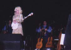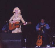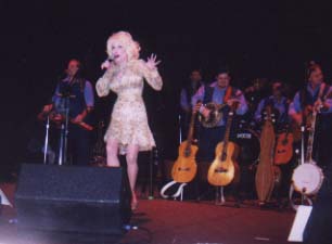 Adam Markle says: Dolly was amazing! The Bluniques started warming up the audience with a song. Then they sung a song called "Little by Little" that was on an album by one of the band members. They then started the same set they have done at most other concerts. She only did one verse of "My Tennessee Mountain Home" and "Halos & Horns". After "Calm on the Water" she did "I Will Always Love You". So we didn't get the silly song medley or "Color Me America". Dolly said she broke a nail playing a song towards the beginning of the concert. Her sleeve on her dress also came undone and she couldn't get it fixed the rest of the show, so she kept making comments about both of those "mishaps". Dolly sounded great and seemed to be in great spirits. The audience was probably about 50 percent of the over 50 crowd. I would say their was only about 20 percent gay and lesbian, and 30 percent young people. There was one drag queen in the audience that Dolly sang "Jolene" to. She at first didn't see any and seemed disappointed, but then a quite large drag queen started jumping up and down and Dolly then noticed her. The concert started a little after 8:00 pm and ended just before 10:00 pm. I got busted from some security guy for taking pictures. He threatened to take my camera away if he saw me take any more pictures. That happened about half way through the concert, so it was hard to enjoy because people around me were taking pictures and I thought I was going to lose my camera. Some camera nazi in the front row kept turning around when anyone was taking pictures and giving nasty looks. All my friends who went with me who weren't big Dolly fans said she was absolutely incredible.