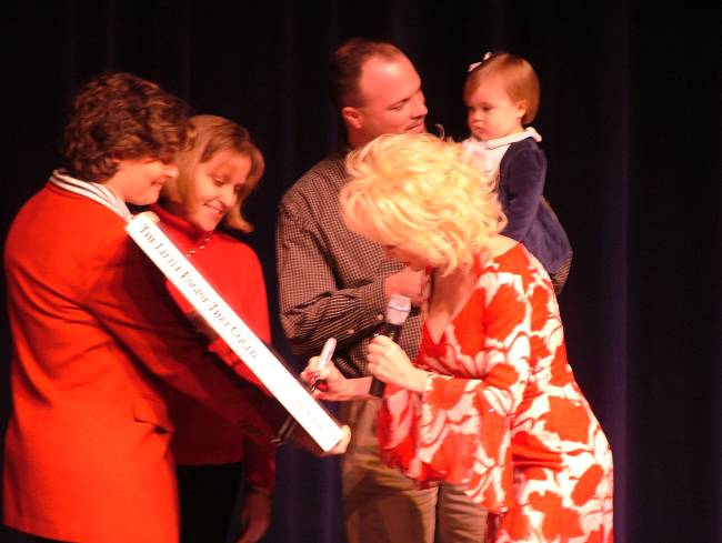 Dolly Parton autographs an oversized copy of "The Little Engine That Could" held by a representative of Penguin Books. The signed book was presented to 1-year-old Cana Beth Waynick of Danville, Ala., to symbolize the 1 millionth book distributed by Parton's Imagination Library literacy program. Waynick is shown with her parents, John Mark and Carrie Waynick.